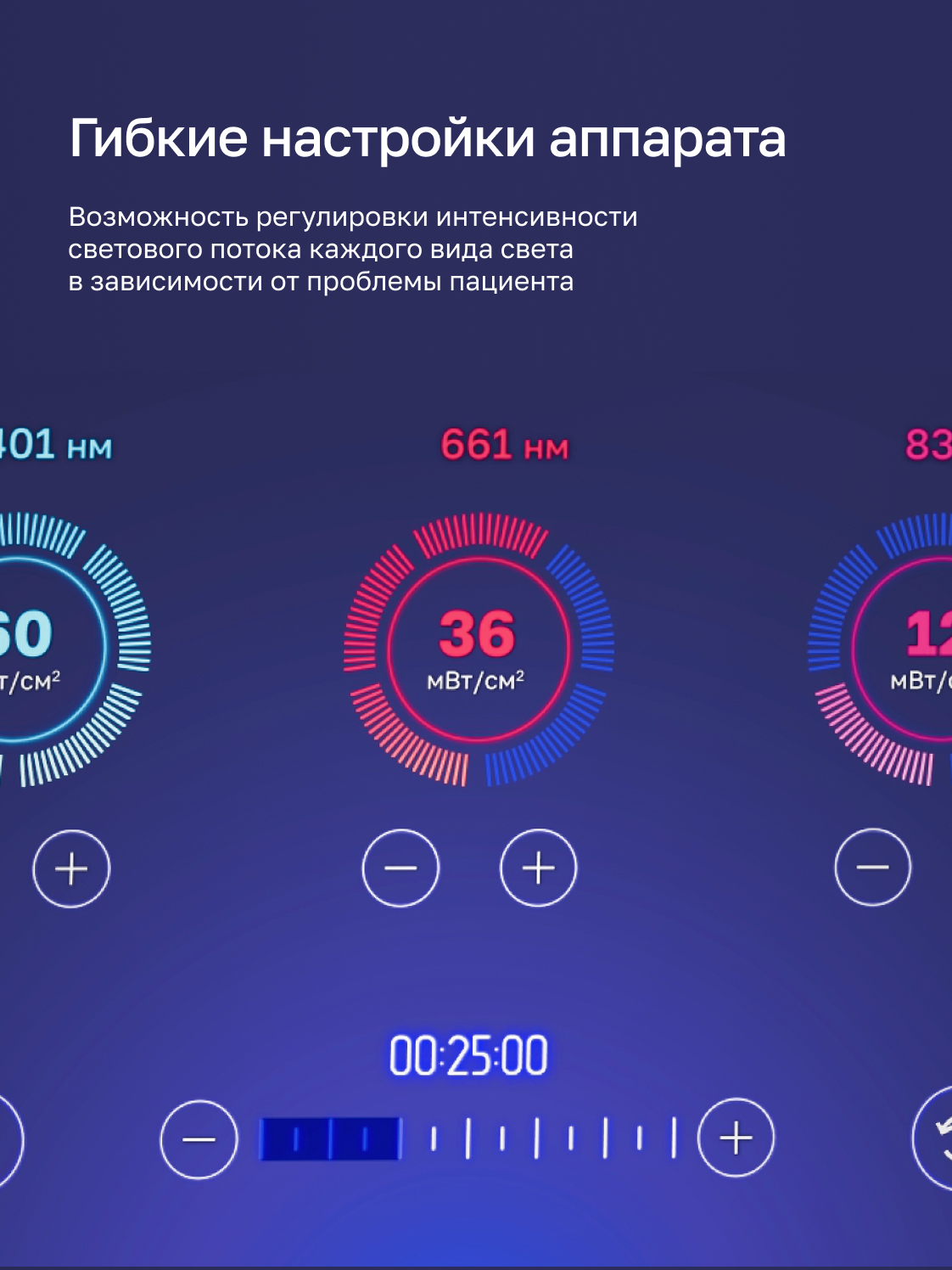 - 400 нм (синий) / 660 нм (красный) / 850 нм (ближний ИК)